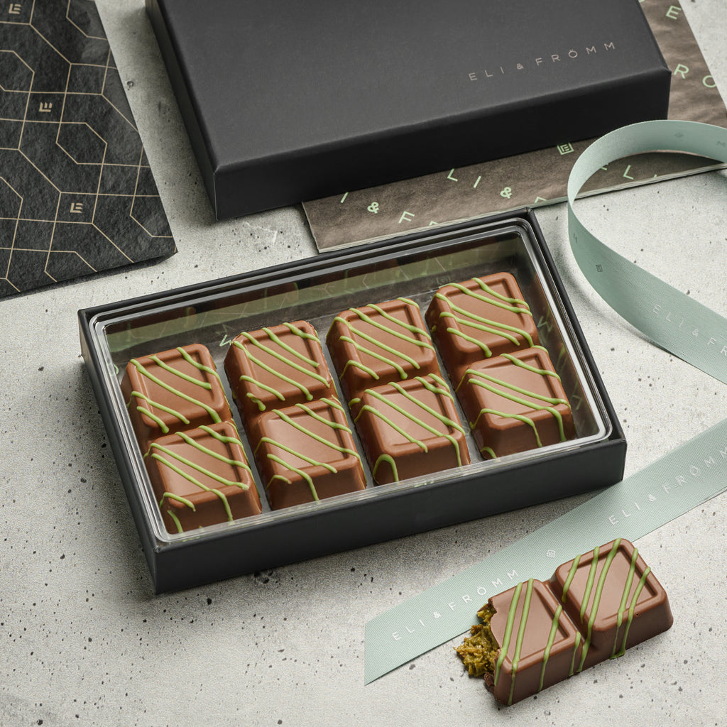 Pistachio milk chocolate mini bars, each reflecting DubaiÕs signature flavors 4 pc gift box Kosher Dairy Cholov Yisroel