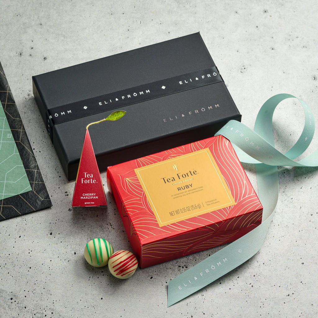 A Tea Forte Ruby mini presentation box of pyramid infusers complimented by a holiday chocolate truffles gift box 8 pc gift box