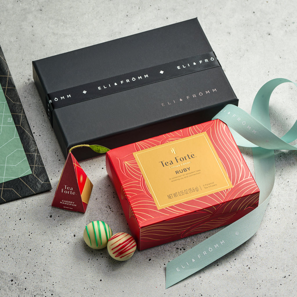 A Tea Forte Ruby mini presentation box of pyramid infusers complimented by a holiday dessert size chocolate truffles gift box 12 pc gift box